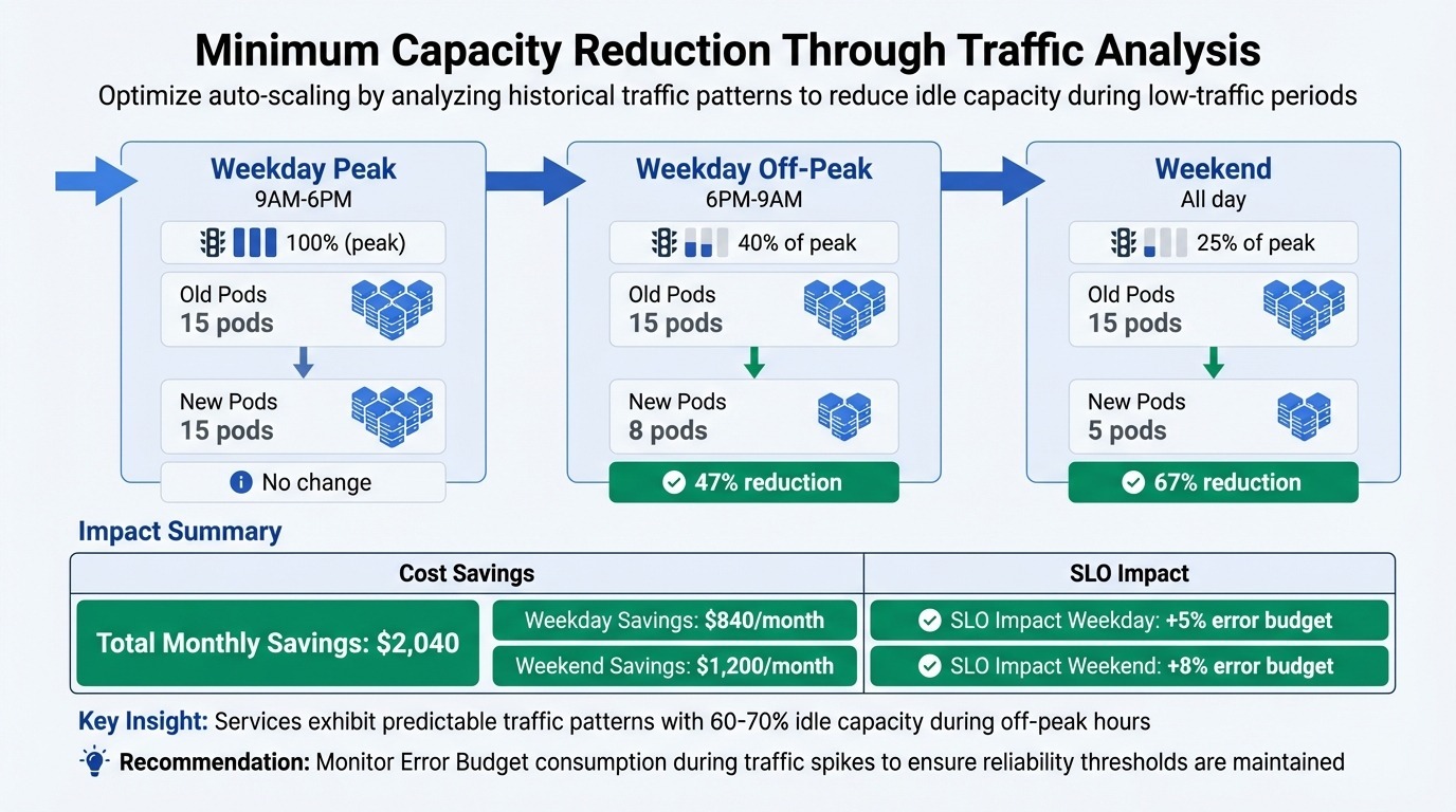 Reduce the minimum pod or node count by analyzing historical traffic patterns and gradually decreasing the minimum capacity while monitoring error budget consumption during traffic spikes. Most services exhibit predictable traffic patterns such as weekday peaks, reduced weekend traffic, and overnight lows. Traditional auto-scaling maintains a constant minimum capacity, leaving substantial idle capacity during 60-70% of operating hours.
