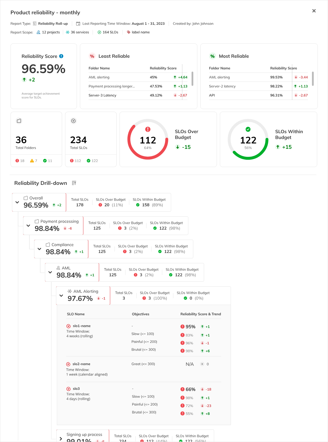The platform's reliability score quantifies the proportion of time services remain within error budget, distilling complex SLO compliance into executive-friendly percentages.