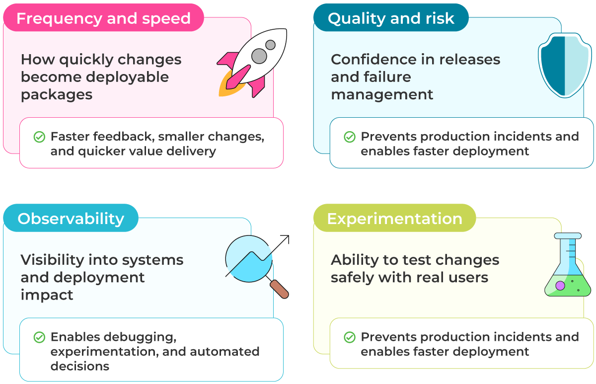 Four maturity dimensions: frequency and speed, quality and risk, observability, and experimentation.
