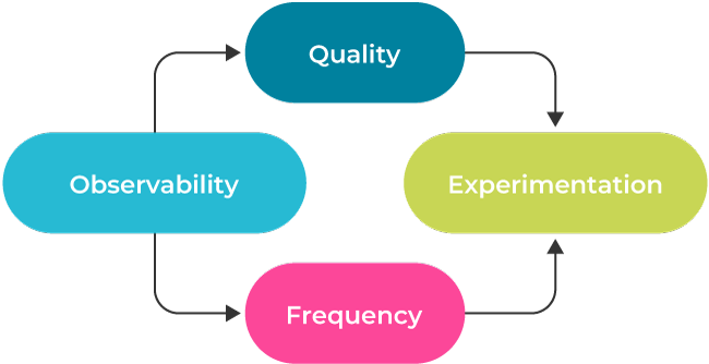 Dimension dependency flow showing observability as a foundation, enabling both quality and frequency, which together enable experimentation