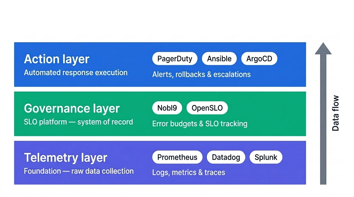Fixing that requires a layered architecture of tools working in concert. At the base, observability platforms collect raw telemetry like logs, metrics, and traces. It then filters it into signals that reflect actual user experience. Above that, a governance layer translates those signals into error budgets, giving teams an objective answer to the question that causes the most arguments: do we ship, or do we stabilize? When budgets burn too fast, an action layer responds, in other words, paging engineers, triggering rollbacks, and opening tickets. IaC practices tie it all together, keeping reliability targets version-controlled alongside your code so they can't drift.