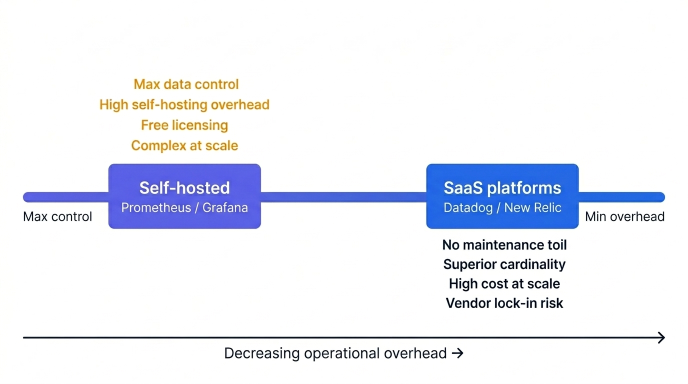 Choosing between self-hosted and SaaS observability comes down to one trade-off: operational overhead versus scalability at high cardinality.