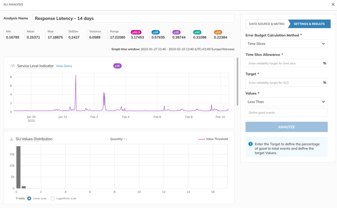 The Nobl9 SLI Analyzer makes this concrete. In the example below, we're pulling a threshold metric query for server response time. Once imported, you get the statistical distribution, percentile values, and a visual breakdown of how that SLI has actually behaved, before you commit it to a policy:
