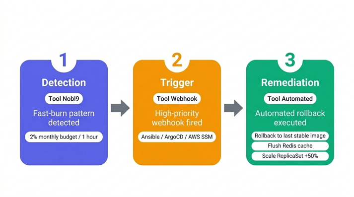 - Trigger: Nobl9 sends a high-priority webhook to your orchestration tool of choice, such as Ansible, ArgoCD, or AWS Systems Manager, along with the SLI_ID and relevant metadata.