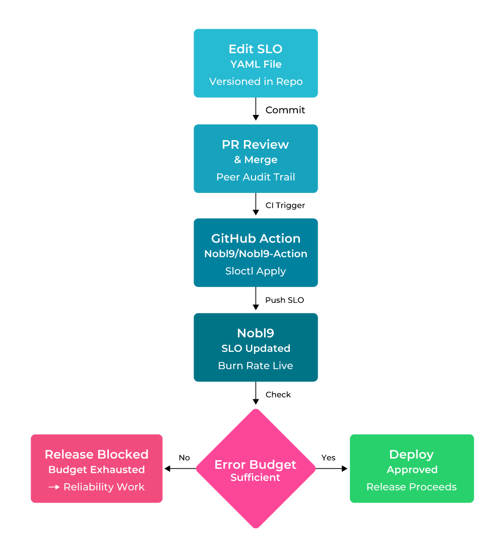 Example SLOs-as-code CI/CD pipeline depicting error-budget-gated deployment.