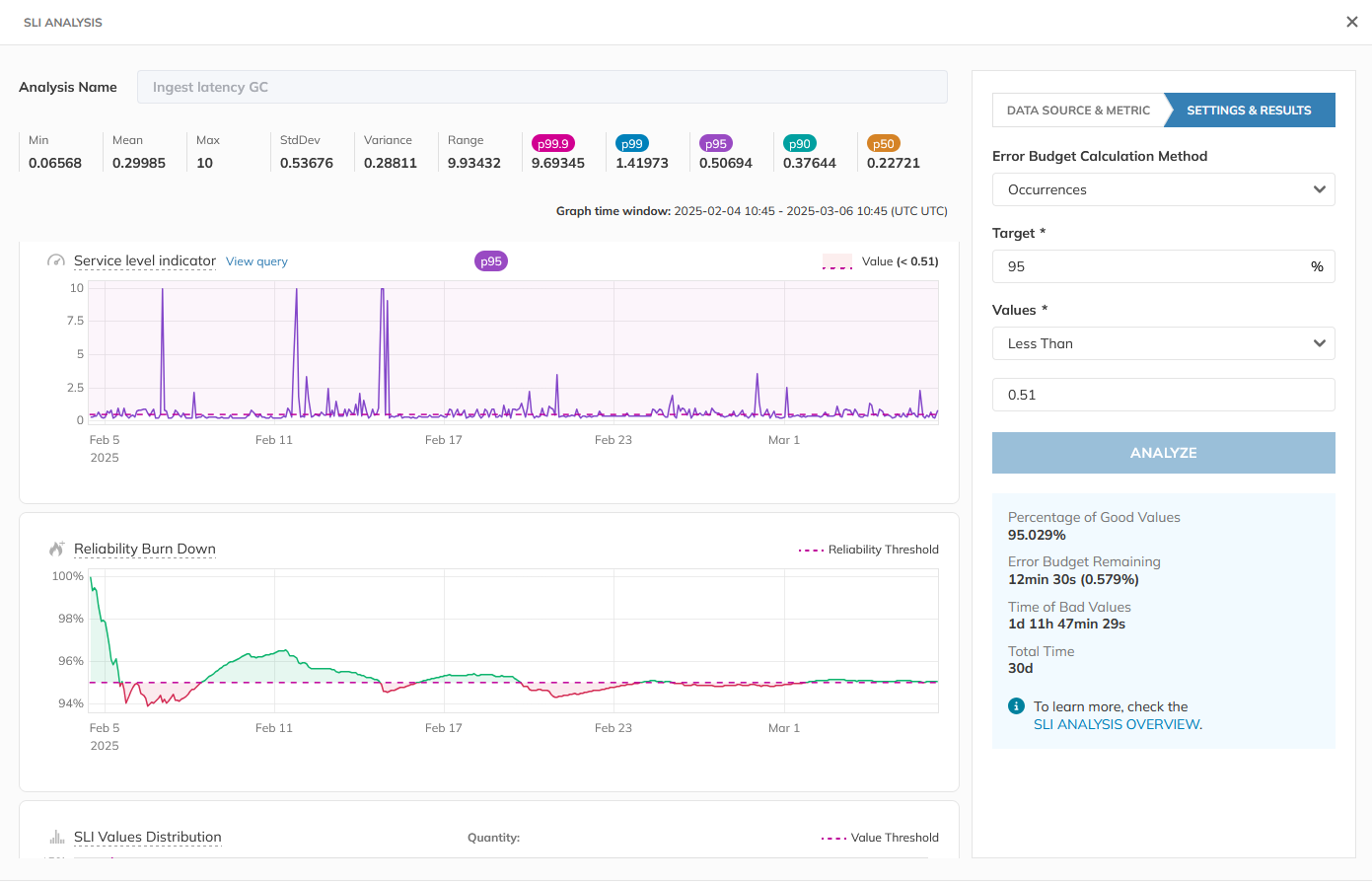 Nobl9 SLI Analyzer: 30-day historical replay for the Ingest Latency service (source)