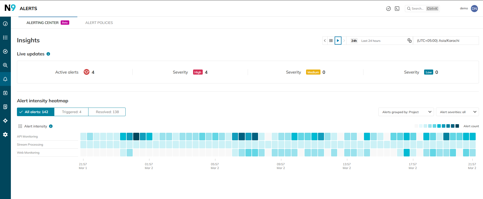 The Nobl9 Alerting Center: By focusing on burn rate intensity (Heatmap) rather than static thresholds, SREs can distinguish between minor fluctuations and critical threats to the error budget. (source)