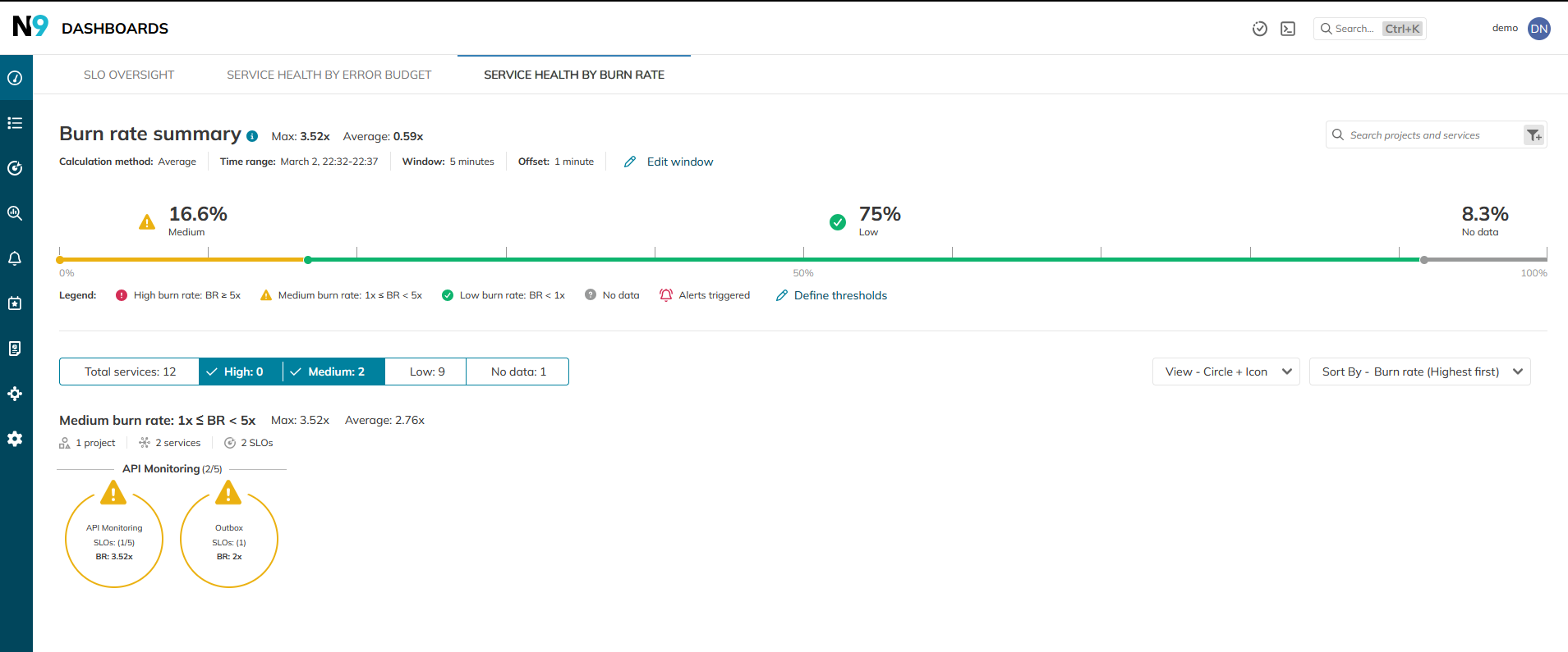 The Nobl9 Alerting Center prioritizes incidents by their threat to the SLO. Responders can immediately see the burn rate and projected budget exhaustion, allowing for impact-first triage. (source)