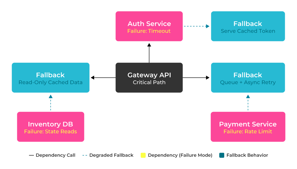 Example of dependency failure modes and degraded fallbacks: Each critical dependency has a defined failure pattern and a deliberate degraded-but-usable response.