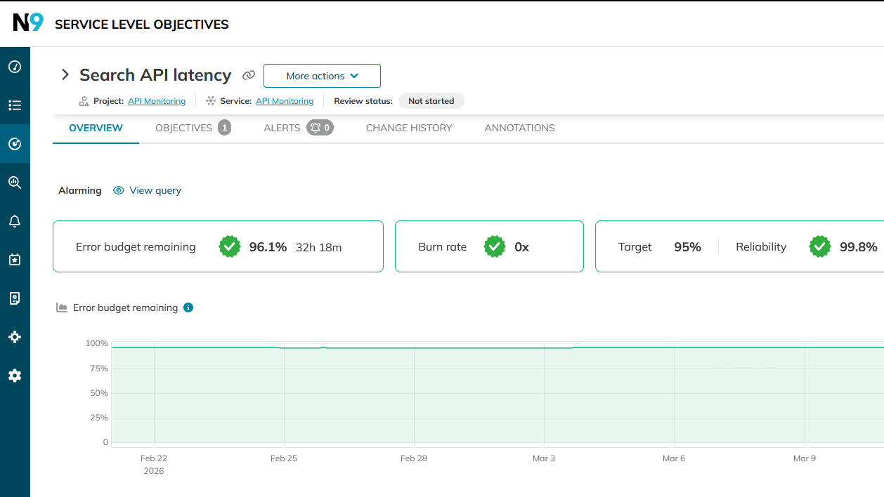 This SLO tracks the checkout service’s success rate by counting successful checkout requests against all requests. Nobl9 divides the two at evaluation time and tracks the ratio against the 99.9% target, meaning no more than 1 in 1,000 checkout attempts can fail before the error budget starts burning.