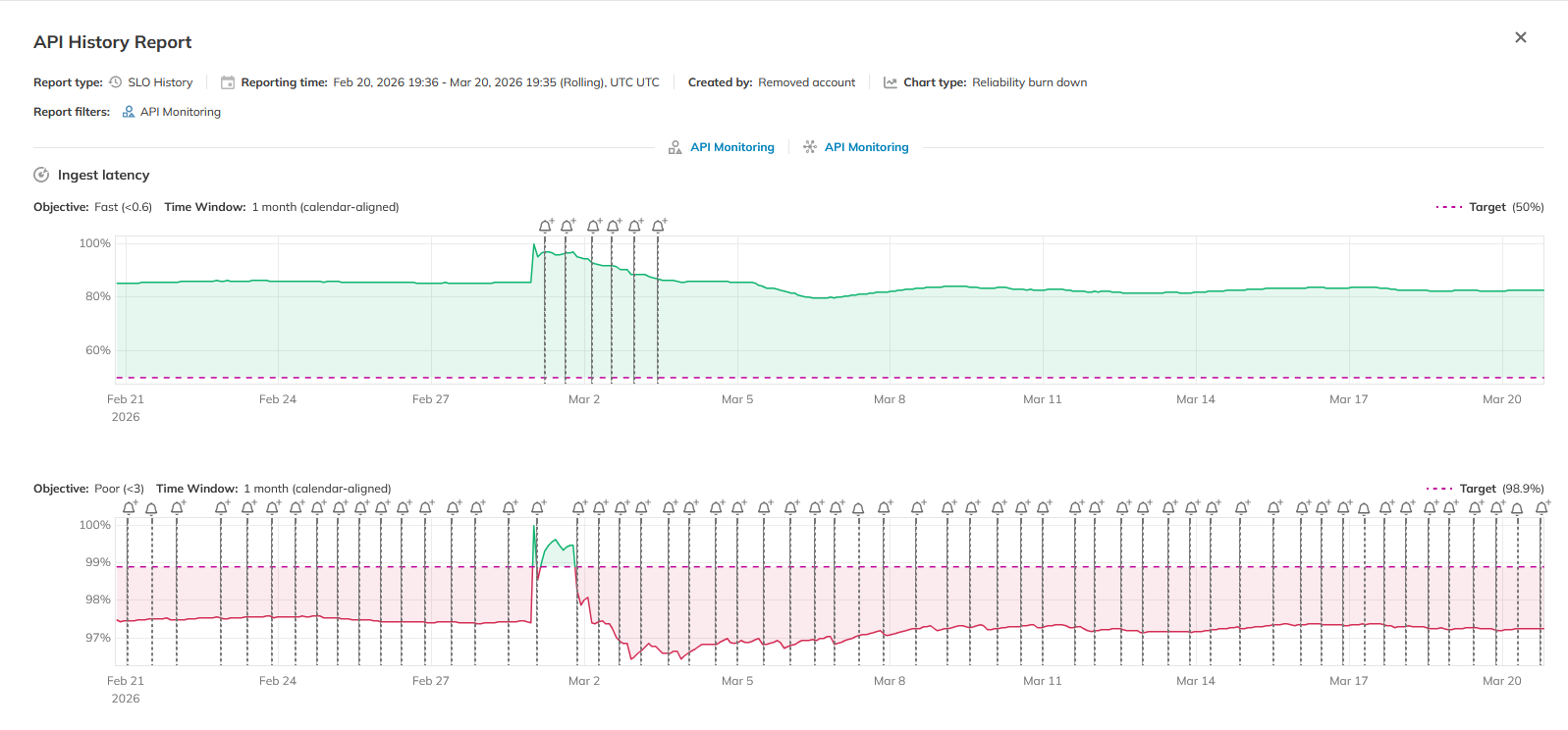 Nobl9 SLO History Report: 30-day reliability burn down across two objectives for a service, with alert events marking the early March degradation period. (source)