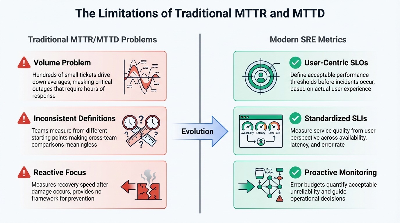 How traditional MTTR and MTTD metrics fall short, and the modern SRE approaches that replace them.
