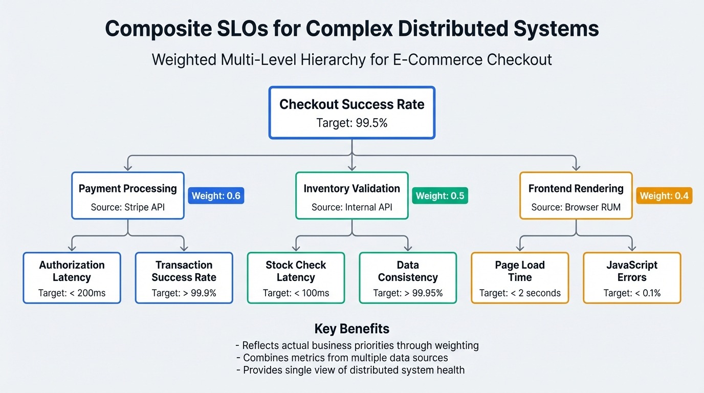 The weighted calculation accounts for different component criticisms. Payment failures completely block purchases (high weight), while slightly slower frontend rendering degrades but doesn't prevent transactions (lower weight). The composite SLO reflects actual customer impact rather than treating all components identically.