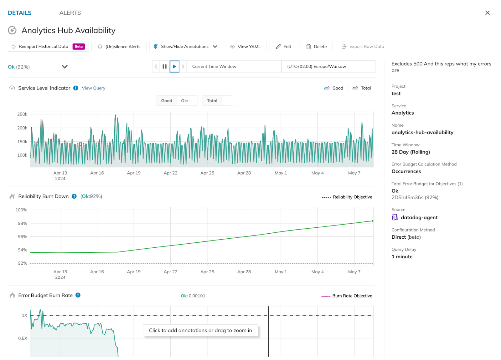 Modern systems retain raw event data while recalculating budgets against new configurations. They enable teams to see how different SLO settings would have performed across months of production traffic.