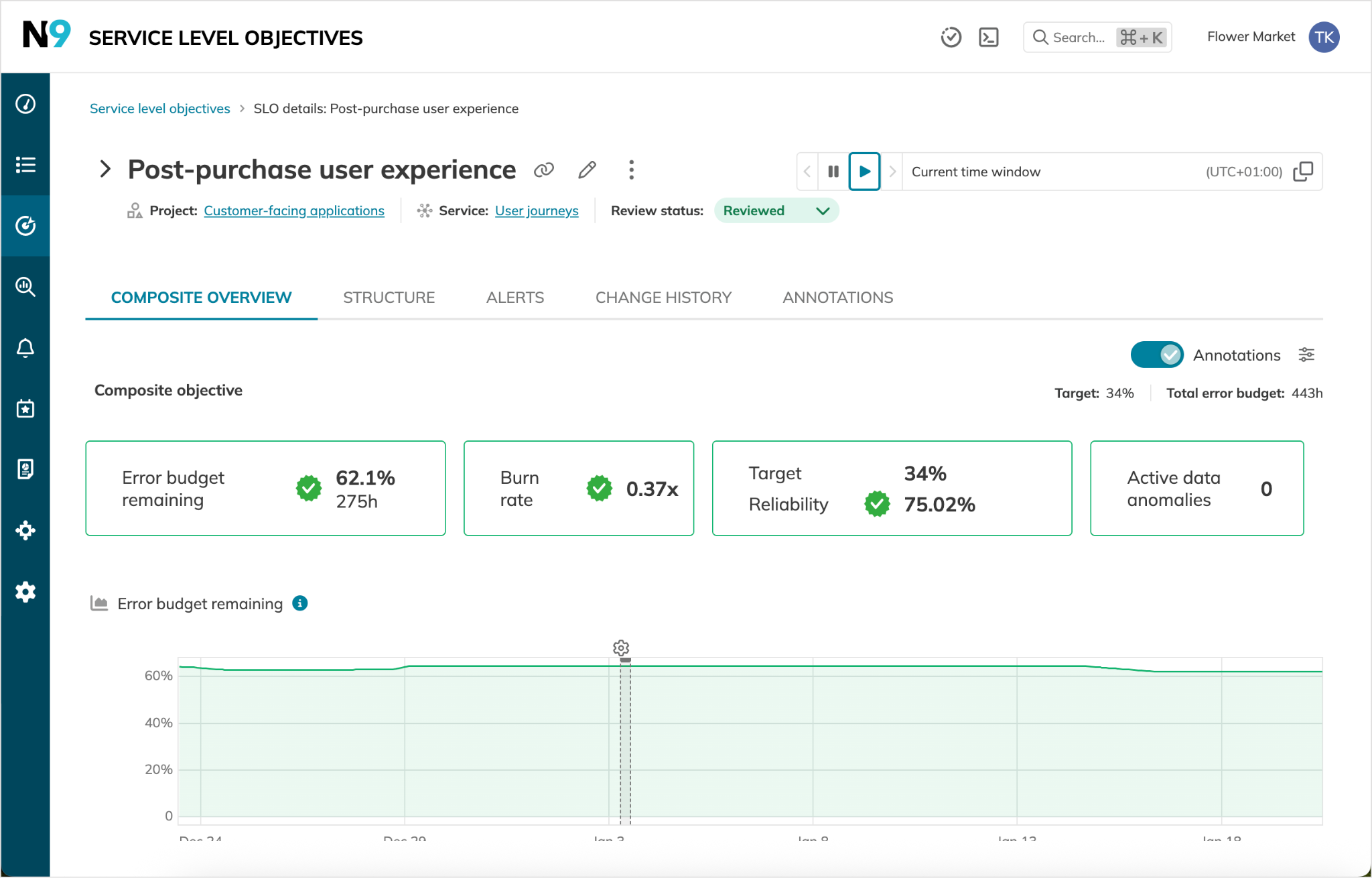 Nobl9's composite SLO view for a post-purchase user experience, showing error budget remaining (62.1%), burn rate (0.37x), and actual reliability (75.02%) against a 34% target across the current time window.