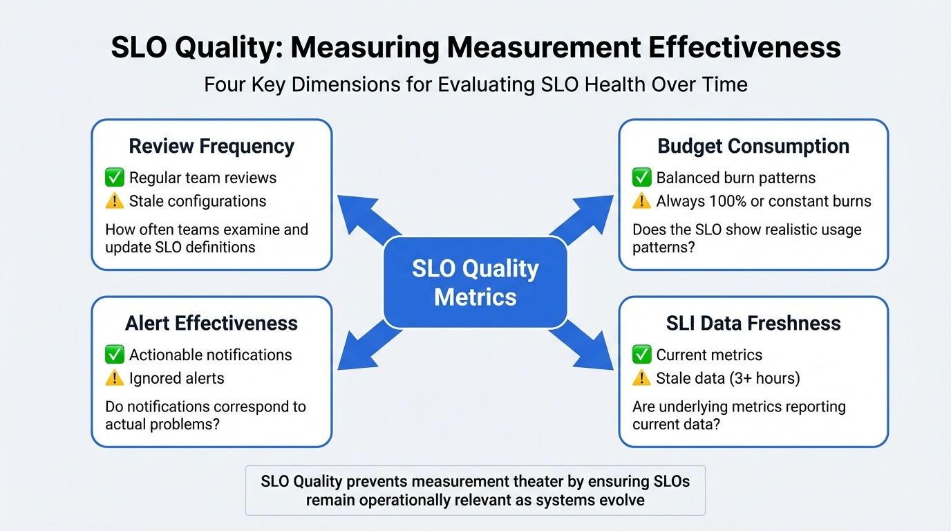 The meta-measurement approach enables continuous improvement. SRE teams track SLO quality metrics with the same rigour they apply to error budgets. They treat quality degradation as operational problems requiring investigation and remediation.